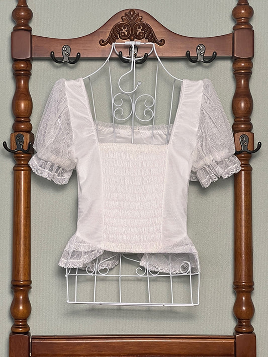 White Square Neckline Short Sleeves Blouse