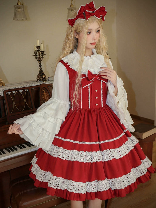 Red Gothic Ouji Lolita Irregular Flounce Hemline Pointed Collar Long Sleeves Shirt