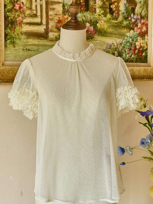 Creamy Ruffle Neckline Short Sleeves Sheer Blouse