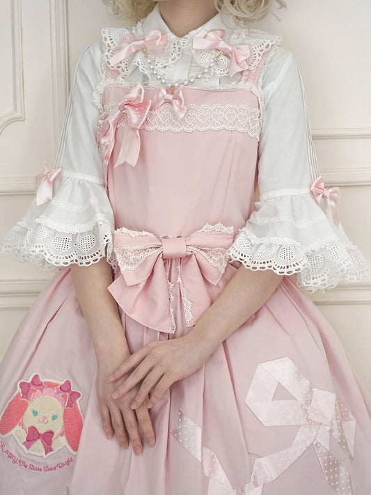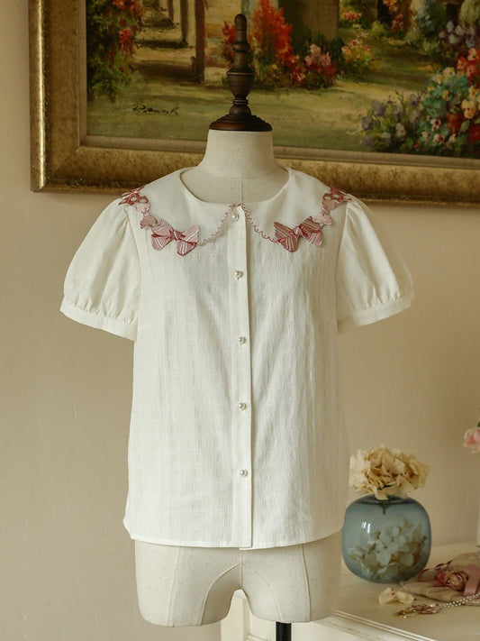 Pink Bowknot Trimmed Collar White Short Sleeves Blouse