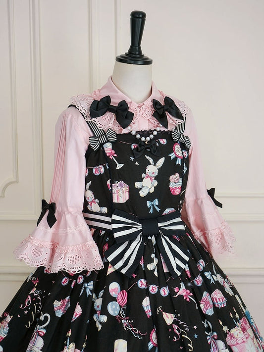 White Short Sleeves Blouse Dark Red&Black Bowknot Bell Striped Dress Set