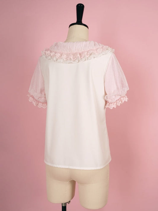 White and Pink Ruffle Trimming Peter Pan Collar Short Sleeves Blouse
