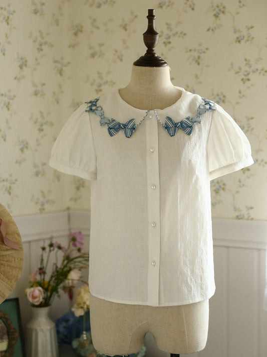 Blue Bowknot Trimmed Collar White Short Sleeves Blouse