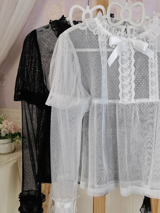 Black Ruffle Neckline Juliette Sleeves Sheer Blouse