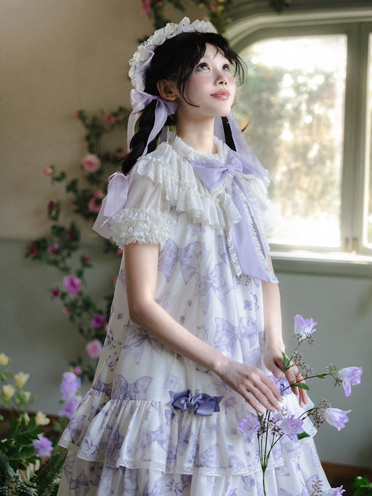 Purple Bowknot Applique Neckline Short Sleeves Top