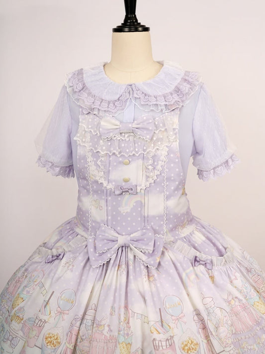 White Removable Bowknot Neckline Beads Short Puff Sleeves Blouse