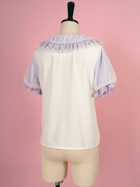 White and Purple Ruffle Trimming Peter Pan Collar Short Sleeves Blouse