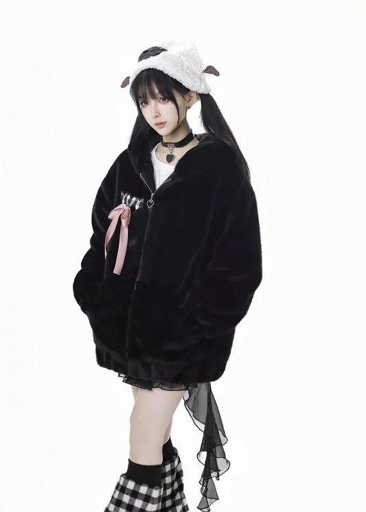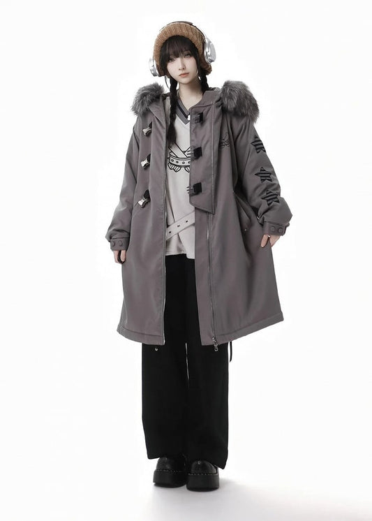 Faux Fur Collar Grey Coat with Star Appliques at Sleeves