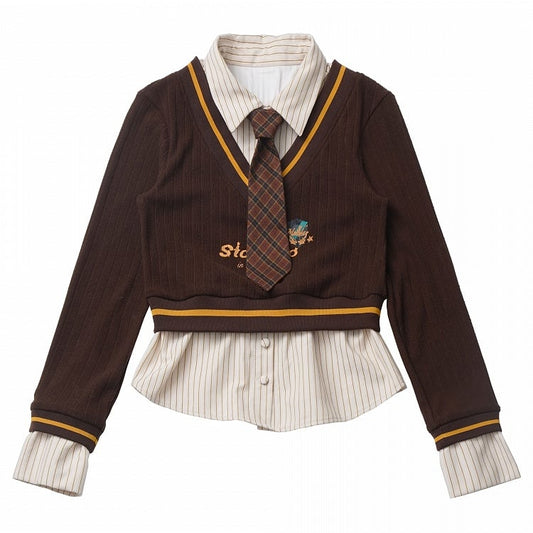 Coffee&White Striped Shirt Collar Fake Two-pieces Sweat Shirt with a Tie