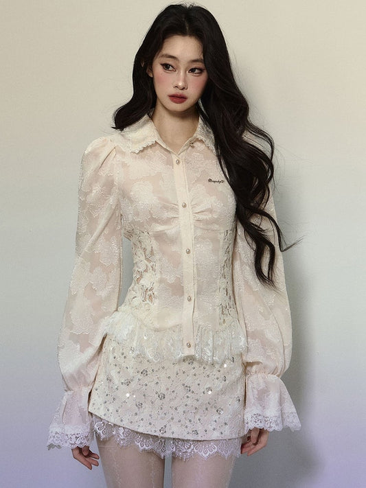 Apricot Lace Patch Waist Puff Sleeves Blouse