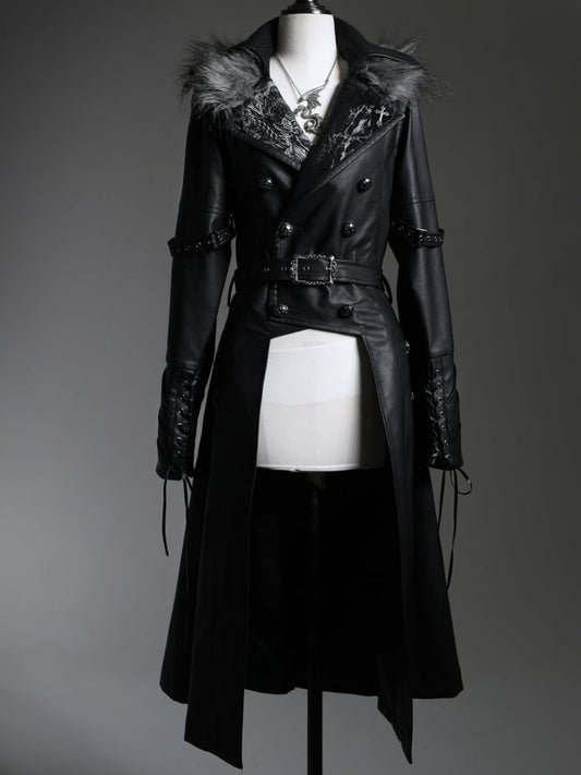 Dragon's Breath Black Faux Fur Collar PU Leather Trench Coat