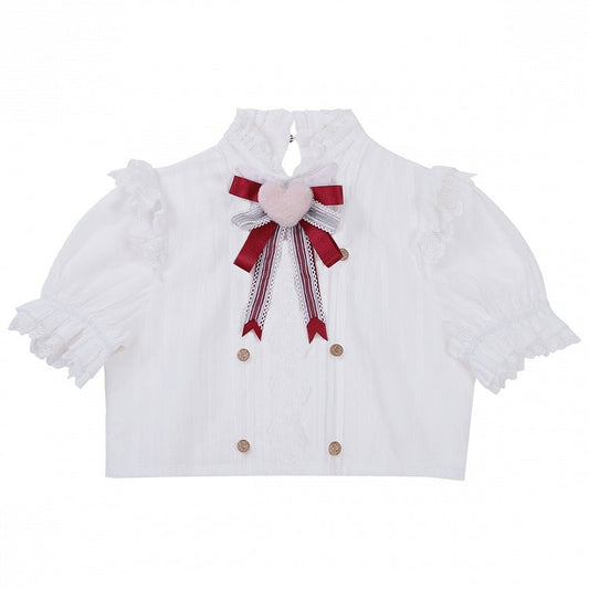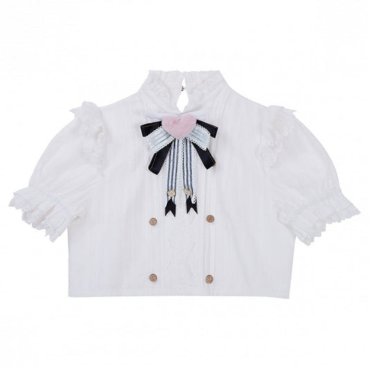 White and Gold Shirt Black Buttons Lolita Heart-Shaped Bow with Ruffled