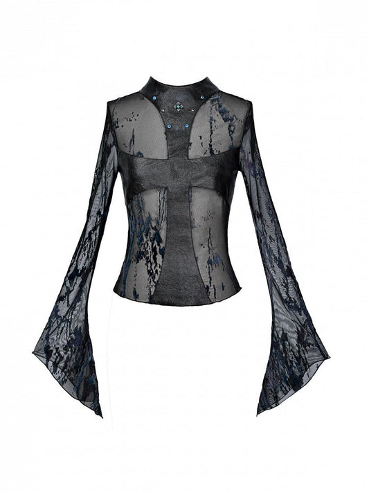 Long Sleeve Details + Bow Tulle Jirai Blouse Skirt High-Waist with White Gothic Train Cross Set Kei Black Lace