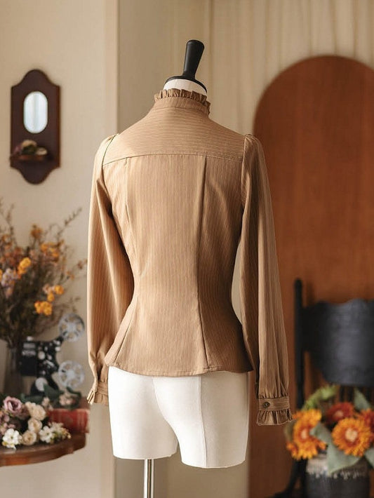 Shirt Long Ruffle Details Light Sleeves Brown with Striped Elegant
