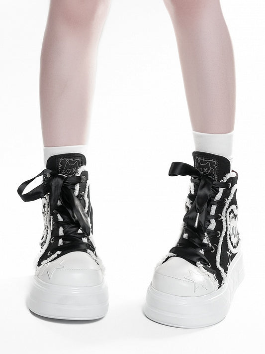 Black Platform Top High Otaku Patches Sneakers Cat - Canvas