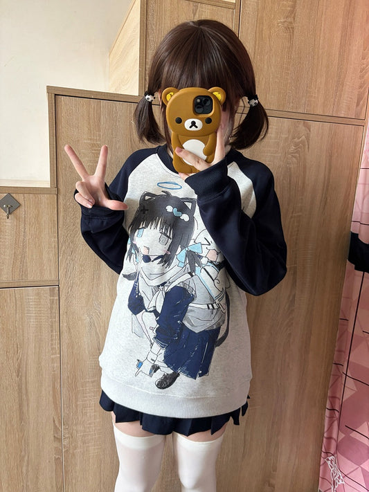 Sweatshirt Pattern Girl Navy Cartoon Design Colorblock with Blue Cotton