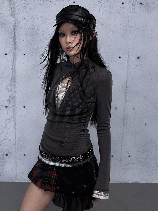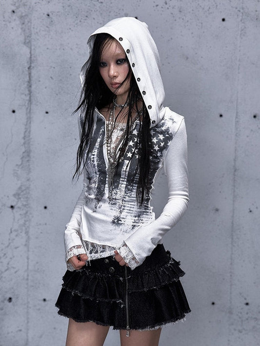 Off-white Two-piece V-Neck Print Hooded Lace Long Top Star Sleeve Slim-fitting Panel -