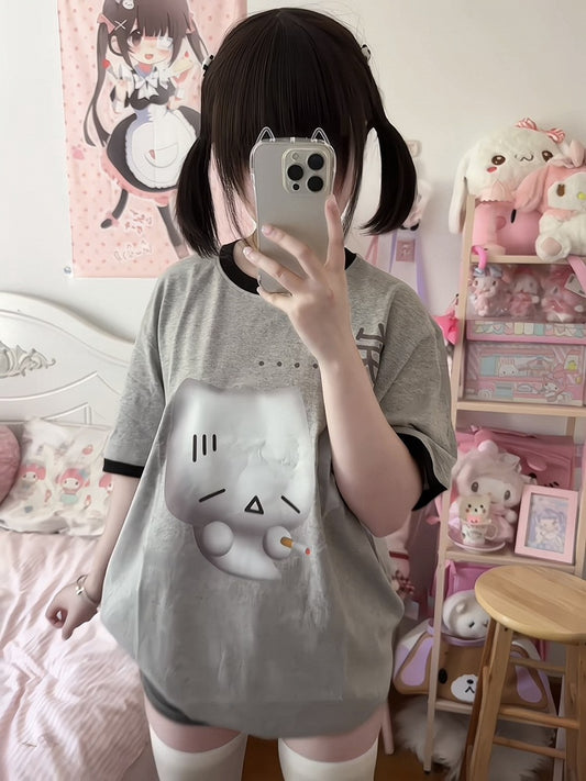 Gray Crewneck T-shirt Sighing with Print Cat Cotton