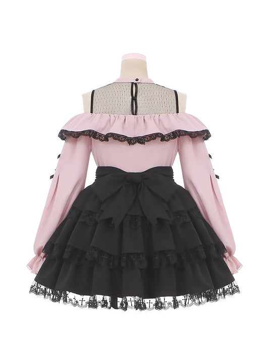 with Pink Bow Black Kei Open Blouse Shoulder Details Jirai Neckline Illusion