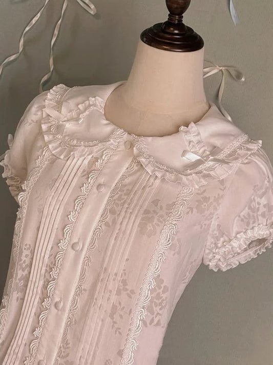 Peter Sleeves Decorated Collar Pan Puff Blouse Bows White Pink