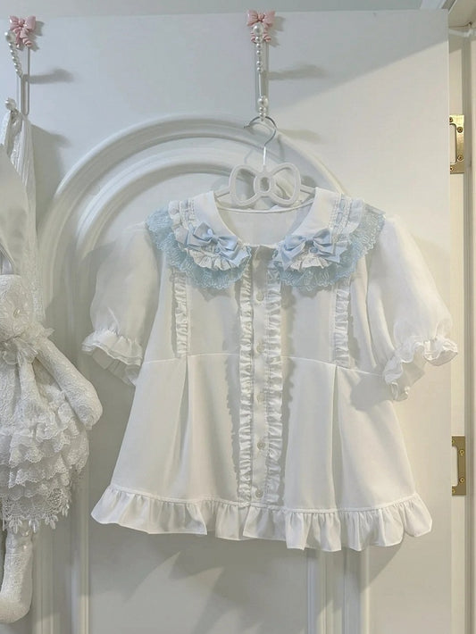 Shirt and Round Sleeves Collar Blue White Flat Lolita Short