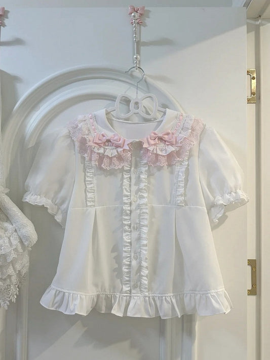 Lolita Round Sleeves Flat Shirt Collar Pink White Short and