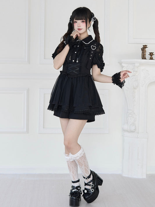 Jirai Kei Black/White Short Sleeves Blouse with Beaded Collar