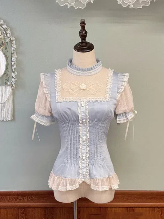 Bowknot Blue Contrast White Ruffled Lace Trim Sweet Sleeveless Top