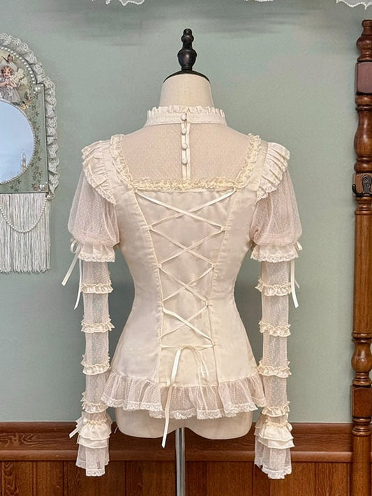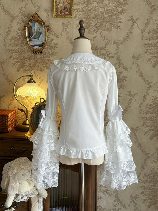 Lace Bell Shirt Long Tiered Peter Pan Sleeves White Collar