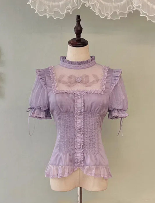 Shirt with Ruffle Neckline Sleeves Purple Short Detachable