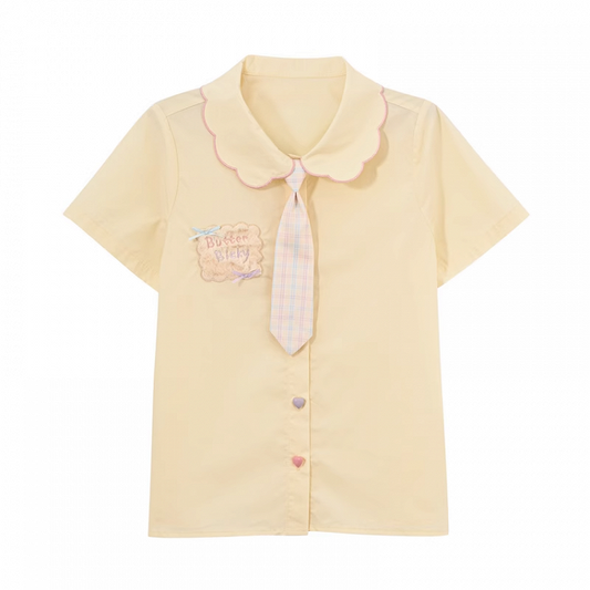 Placket Embroidery Light Tie Petal Collar Biscuit Heart Buttons with Blouse Yellow