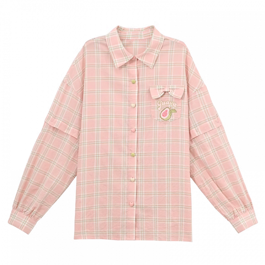 Pink Button Green Placket Guava Embroidery Heart Plaid Shirt with Detachable Sleeves