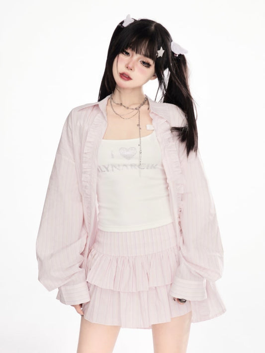 Pink Ruffle Trim Loose Striped Shirt