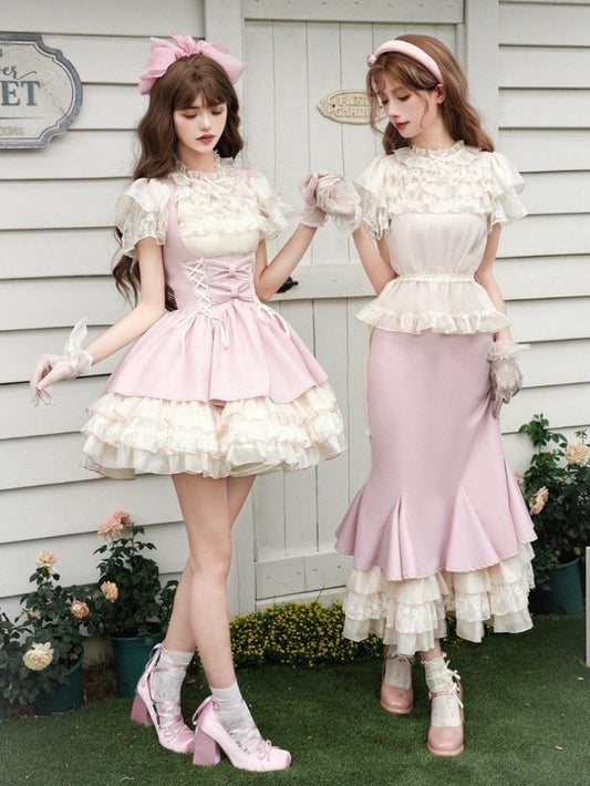 Mermaid Lolita and Boned Design Elegant Pieces Dress Pink Waist Blouse Two Fake Black Skirt