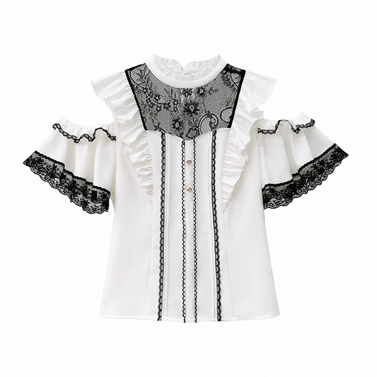 Short Neckline Kei and Illusion Black Cutout with White Blouse Lace Jirai Sleeves Shoulder Trim