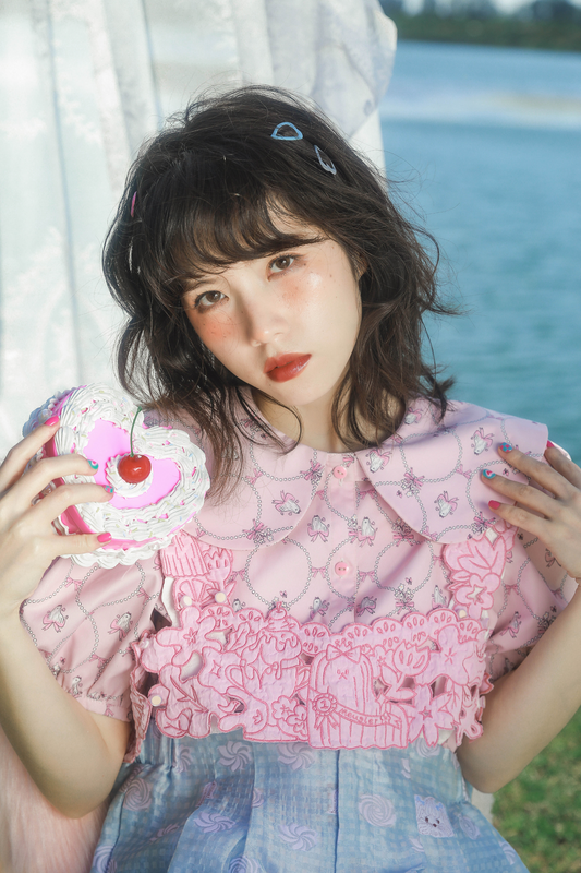 Multi-layered Set Blouse + Belt - Mesh Elegant Bell Sleeves Waist Skirt Lolita Cotton Vest Pink Classic Tulle Dotted