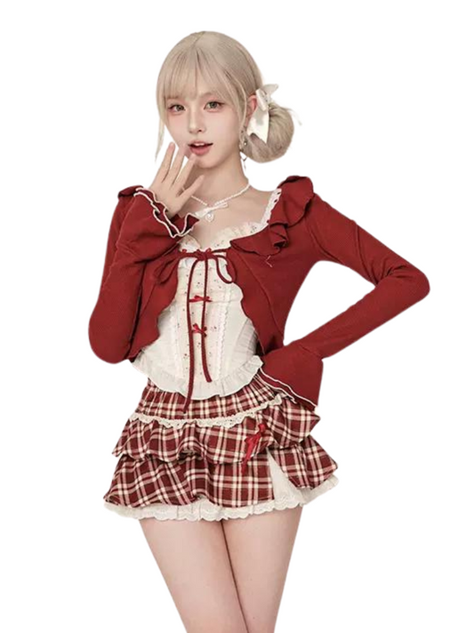 Wine Cherry Red Skirt + Top Waist Vest Cardigan Red Summer Red Check + High Sweet Suit