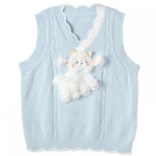 Yume Kawaii Blue Knitted Vest with Plush Lamb at Front
