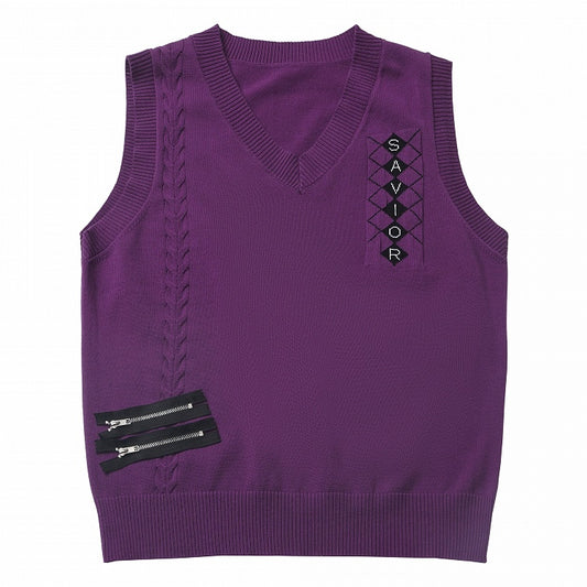 Spring Knitted Vest Zipper Details Style Purple V-neck Preppy