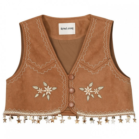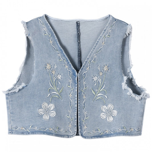 Blue Denim Vest Wash Distressed Embroidery Faded Floral