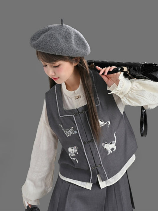 Gray Cheongsam Style Square Neckline Cat Embroidery Knot Button Vest