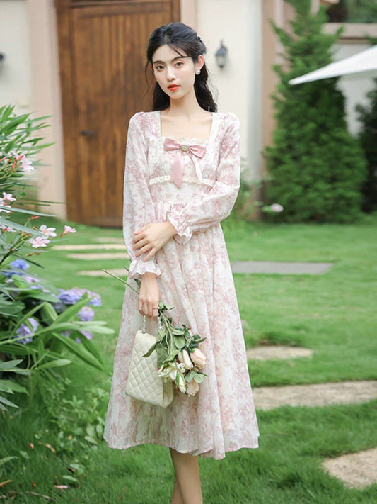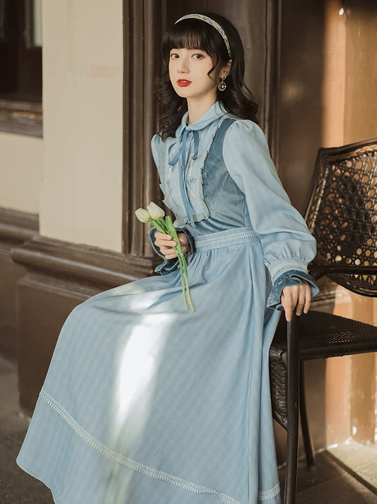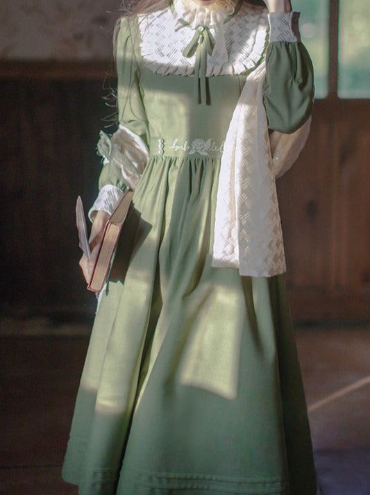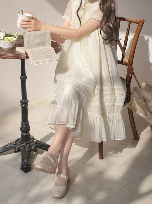 Retro Layered Suspender Dress + Lace College Ribbon + Accessories Shirt Pleated Shoulder Ruffle Elegant
