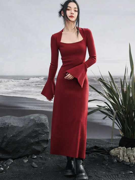 Retro Knit Leather Dress Asymmetrical China Tassel