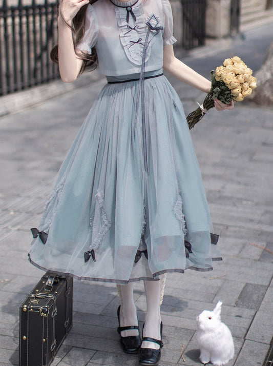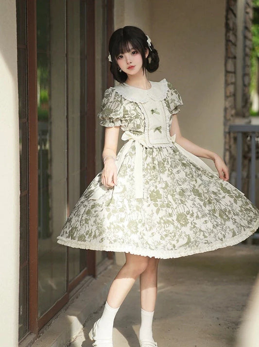 Lolita Dress Sleeves Vintage Teddy Bear Print Sweet Flutter Mint Green JSK