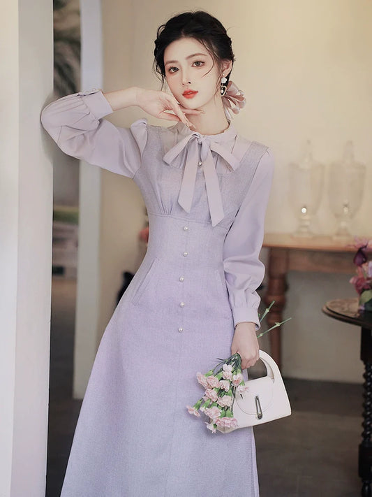 Dress Emblem + Tie + Blouse + Ruffle Retro College Beret Cyan Style Elegant Chiffon