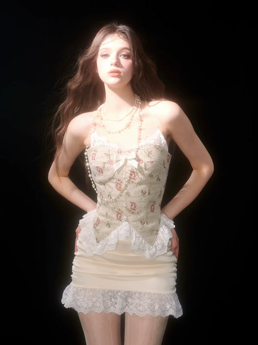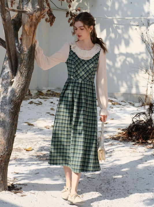 Collar Skirt Retro Suspender Green Check Ruffle Blouse Lace