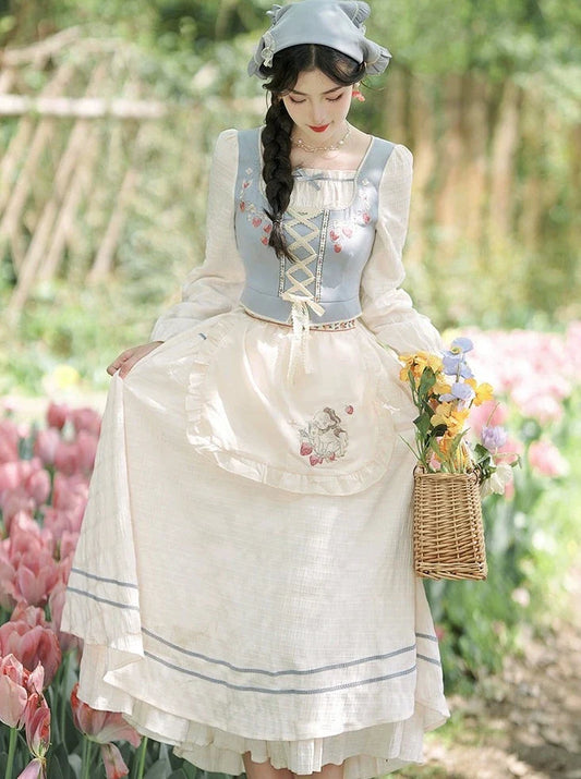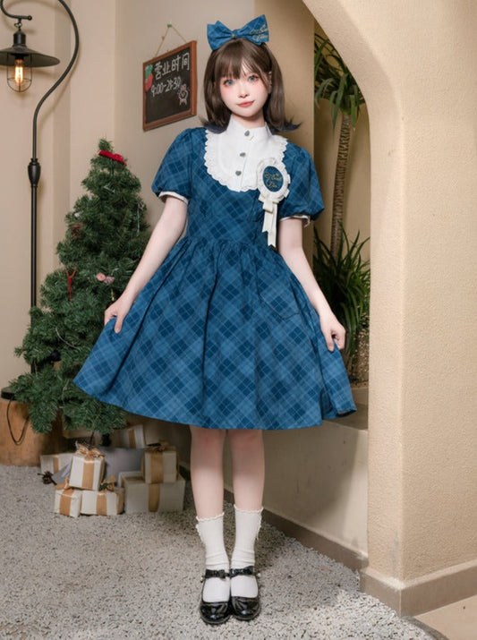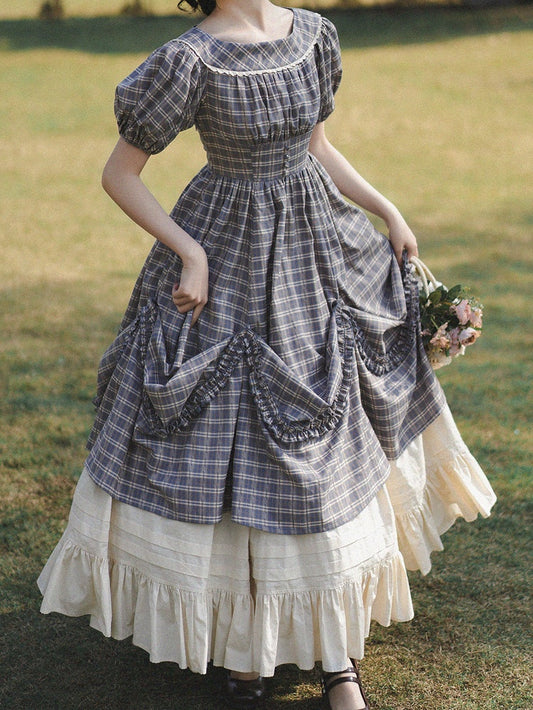 Cottagecore Retro Puff Blue Fashion Dress Sleeves Plaid Dusty Neckline Off-the-shoulder
