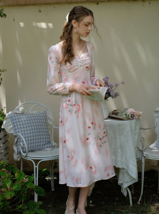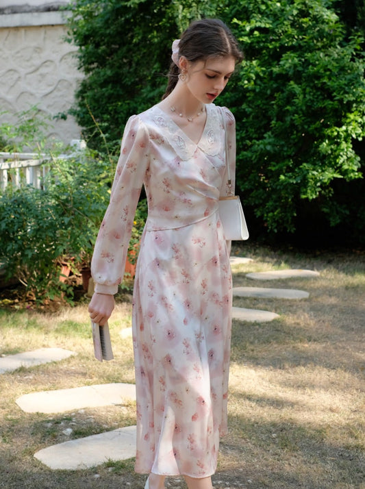 Dark Green Vintage Floral Lace Trim Square Neckline Leg-of-Mutton Sleeves Dress