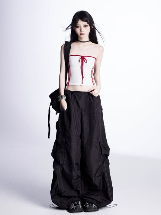Wide-Leg Cargo Pants Waist Drawstring Cuffs Vintage Black Low