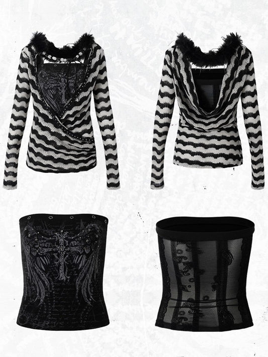 White with Vintage Set Deconstructed Fur Design Bustier Black Striped Top Faux Knit